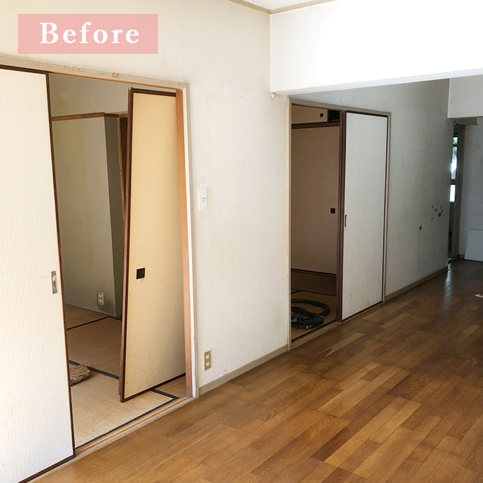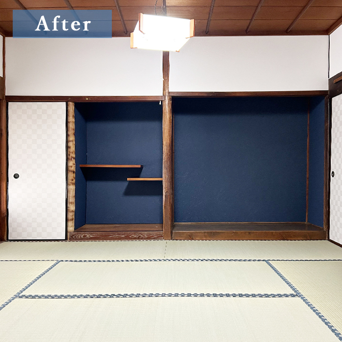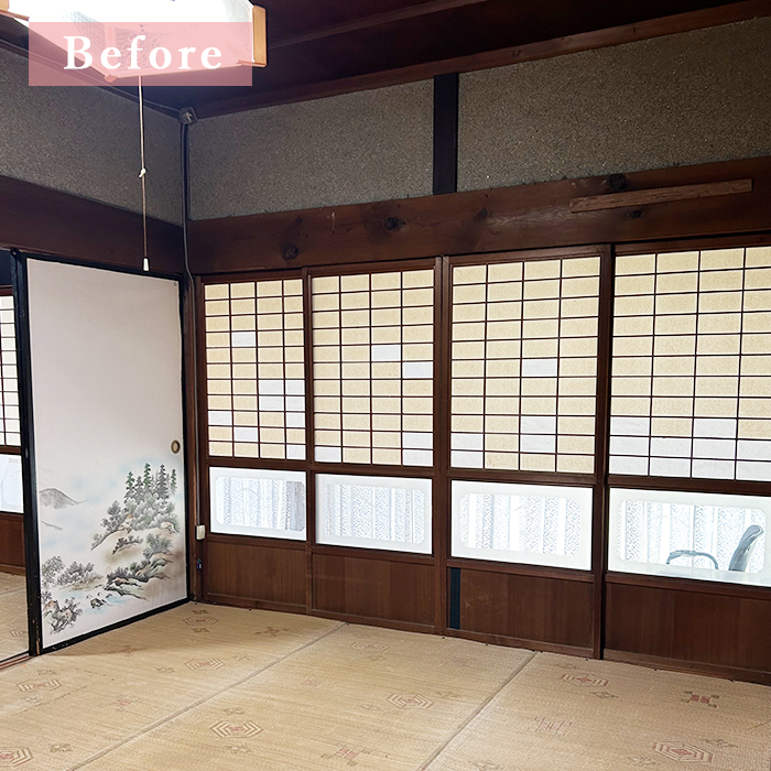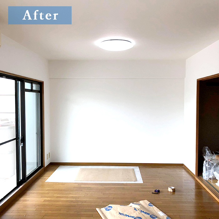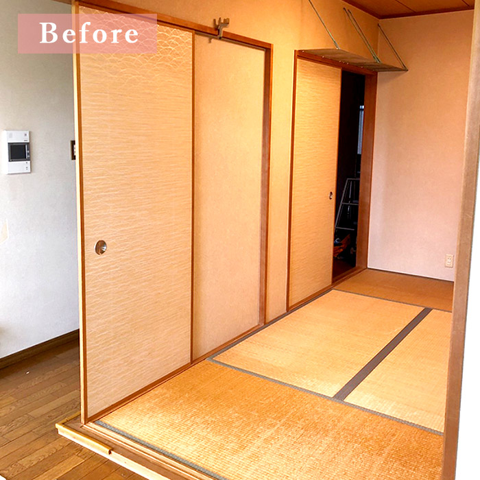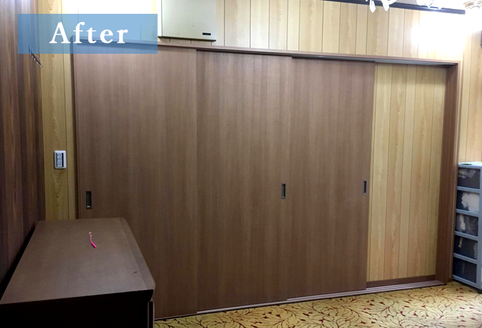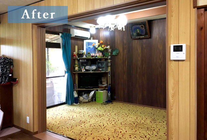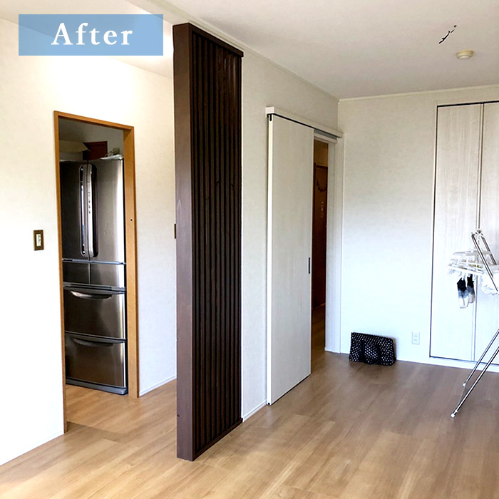 引違い襖をアウトセットドアに、押入襖を折戸に変えられて、キッチンとの目隠しに格子を建てられて、梁部分は、木目柄のクロスを貼られて、とてもお洒落で広々としたリビングになりました。これで皆さんがお集まりになられても広々と過ごせますね!
