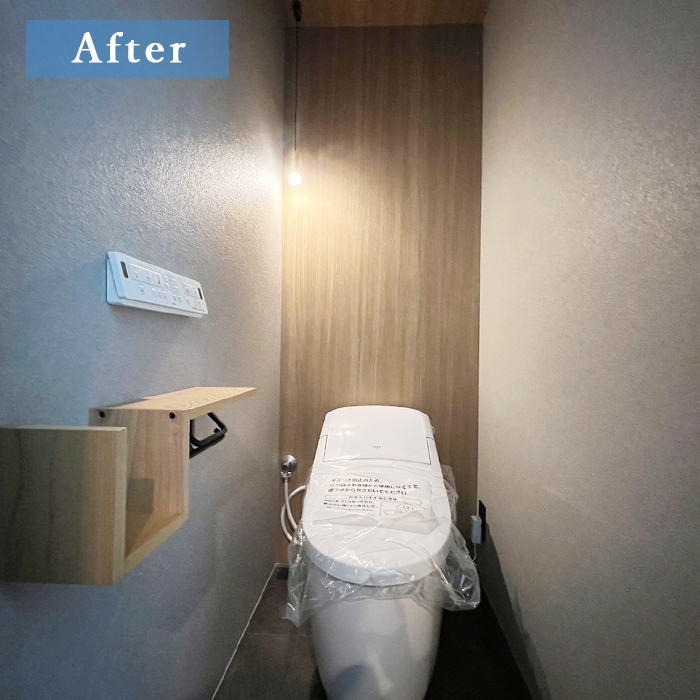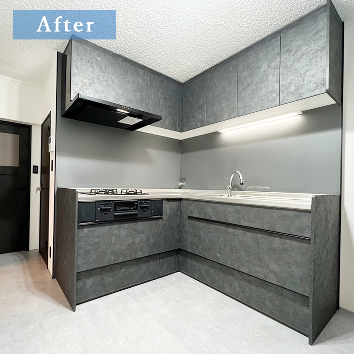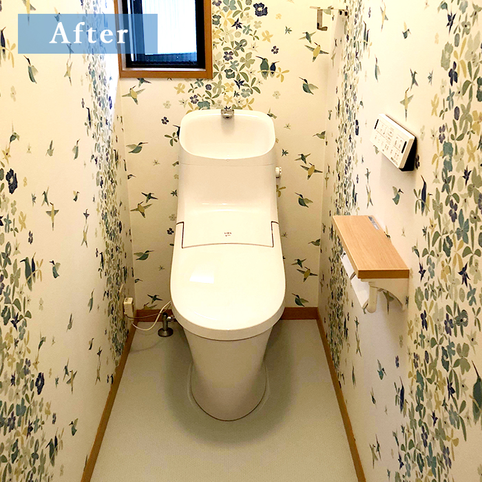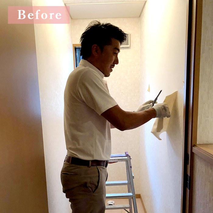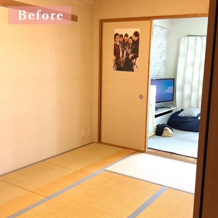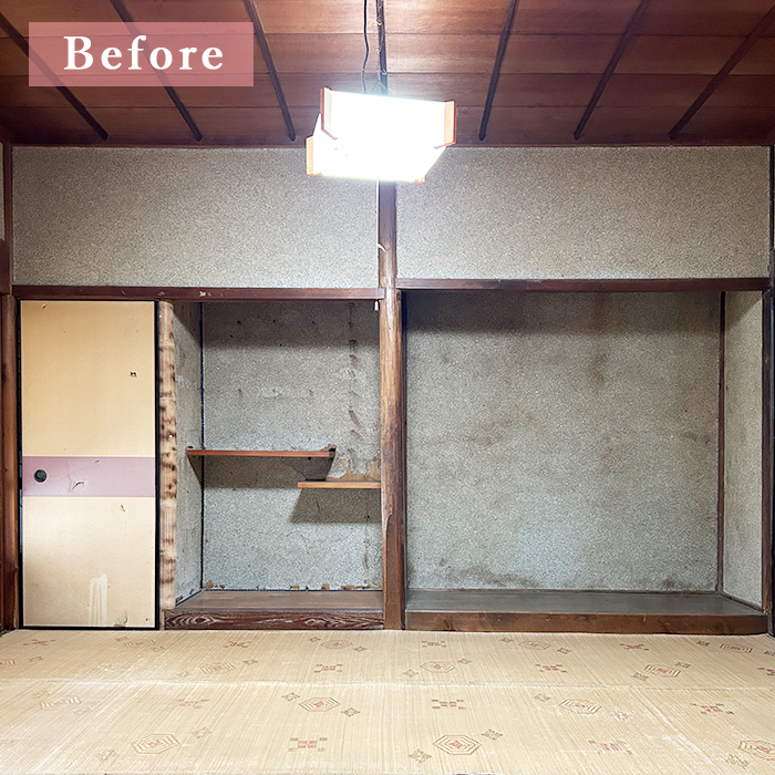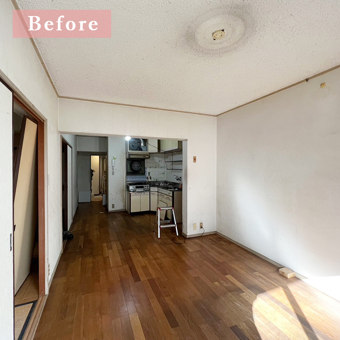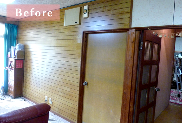 引違い襖をアウトセットドアに、押入襖を折戸に変えられて、キッチンとの目隠しに格子を建てられて、梁部分は、木目柄のクロスを貼られて、とてもお洒落で広々としたリビングになりました。これで皆さんがお集まりになられても広々と過ごせますね!